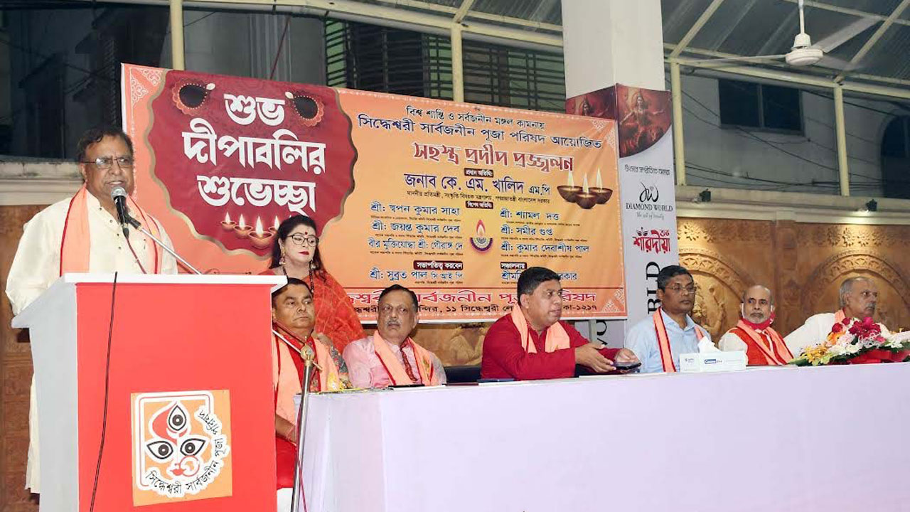 কে এম খালিদ বলেন, শ্যামা পূজা উপলক্ষ্যে সিদ্ধেশ্বরী সর্বজনীন পূজা উদযাপন পরিষদের উদ্যোগে আজ যে সহস্র প্রদীপ প্রজ্বলন করা হলো, এ প্রদীপের আলো ছড়ানোর মধ্য দিয়ে যেন সমগ্র দেশ ও বিশ্বকে আলোকিত করে।