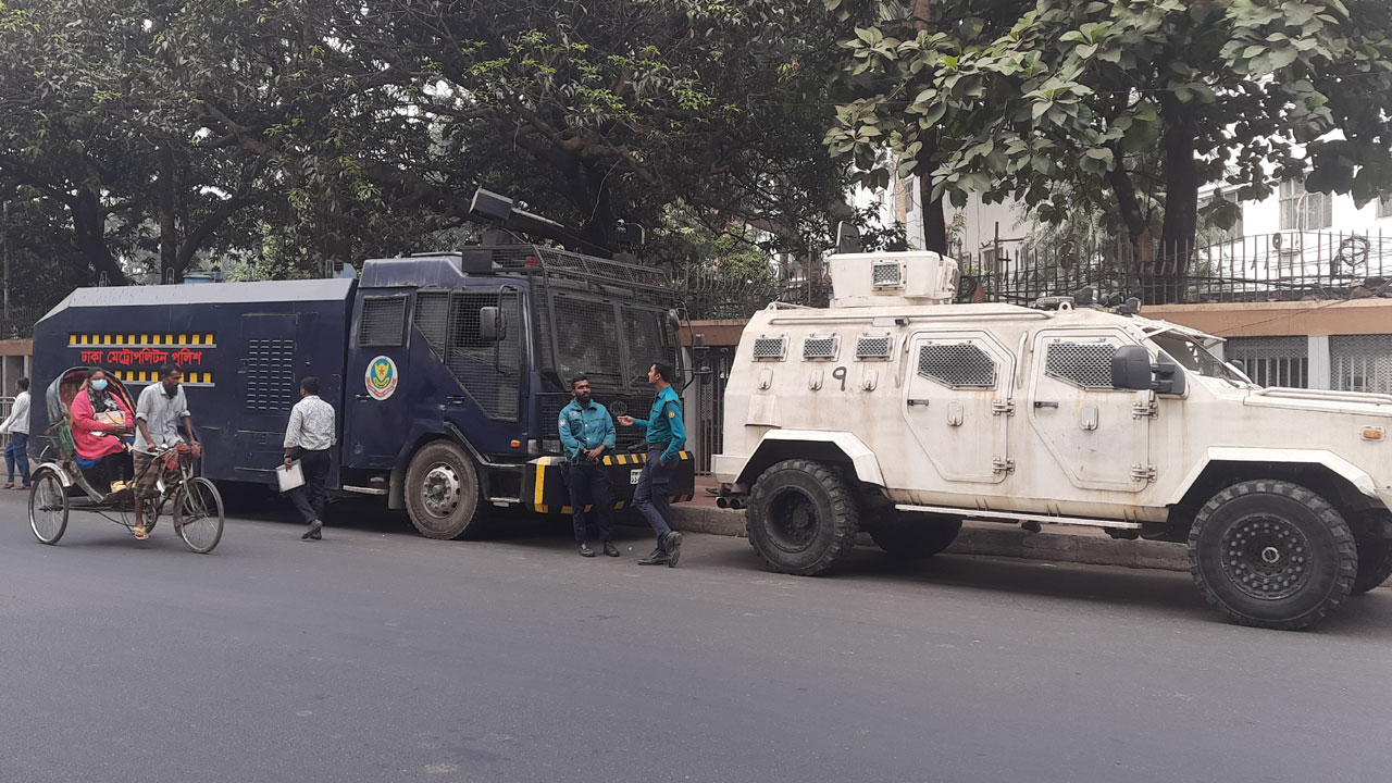সরেজমিনে ঘুরে দেখা যায়, প্রেস ক্লাবের সামনেই সারিবদ্ধভাবে দাঁড়িয়ে আছেন পুলিশ সদস্যরা। পাশেই রাখা আছে প্রিজনভ্যান ও পুলিশভ্যান। অপর পাশের সড়কে রাখা আছে জলকামান এবং এপিসি (রায়টকার)। অপরদিকে কদম ফোয়ারার সামনে এবং প্রেস ক্লাবের শেষ প্রান্তেও মোতায়েন করা আছে অতিরিক্ত পুলিশ।