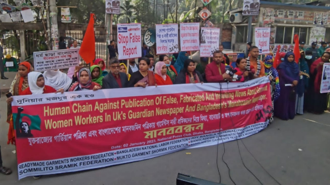 যুক্তরাজ্যের গার্ডিয়ান পত্রিকা এবং বাংলাদেশের মানবজমিন পত্রিকায় গার্মেন্টস নারী শ্রমিকদের নিয়ে মিথ্যা, বানোয়াট ও অপমানজনক খবর প্রচার করার প্রতিবাদে মানববন্ধন করেছে গার্মেন্টস শিল্পের সক্রিয় ৭টি শ্রমিক ফেডারেশন। পত্রিকা দুটিকে রাষ্ট্রীয় বিচারের আওতায় আনারও দাবি জানিয়েছে সংগঠনগুলো।
