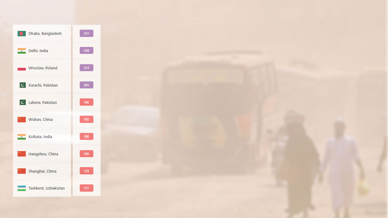 আজ ভারতের দিল্লি ও পোল্যান্ডের রোকলাও যথাক্রমে ২৪০ ও ২১৪ একিউআই স্কোর নিয়ে দ্বিতীয় ও তৃতীয় স্থানে রয়েছে।