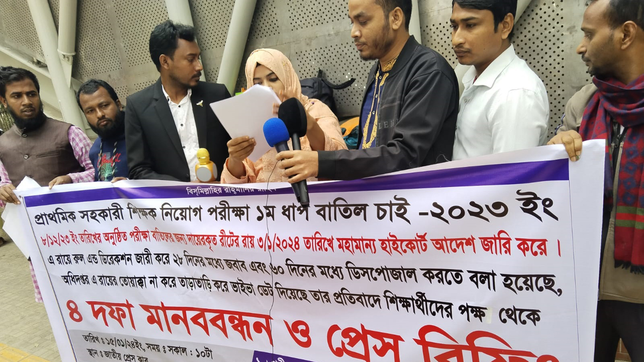 মানববন্ধনে পরীক্ষার্থীরা বলেন, আমরা ২০২৩ সালে আয়োজিত প্রাথমিক বিদ্যালয়ের সহকারী শিক্ষক নিয়োগ পরীক্ষার ১ম ধাপের পরীক্ষার্থী। গত ৮ ডিসেম্বর অনুষ্ঠিত প্রথম ধাপের পরীক্ষায় বরিশাল, রংপুর ও সিলেট বিভাগসহ ১৮টি জেলার ৩ লাখ ৬০ হাজার ৬৯৭ জন পরীক্ষার্থী ছিলেন। কিন্তু এ নিয়োগ পরীক্ষা ব্যাপক প্রশ্নপত্র ফাঁস, অব্যবস্থাপনা ও উত্তরপত্র জালিয়াতির মাধ্যমে অনুষ্ঠিত হওয়ায় আমরা সাধারণ শিক্ষার্থীরা ভারাক্রান্ত ও হতাশ হয়ে পড়েছি।