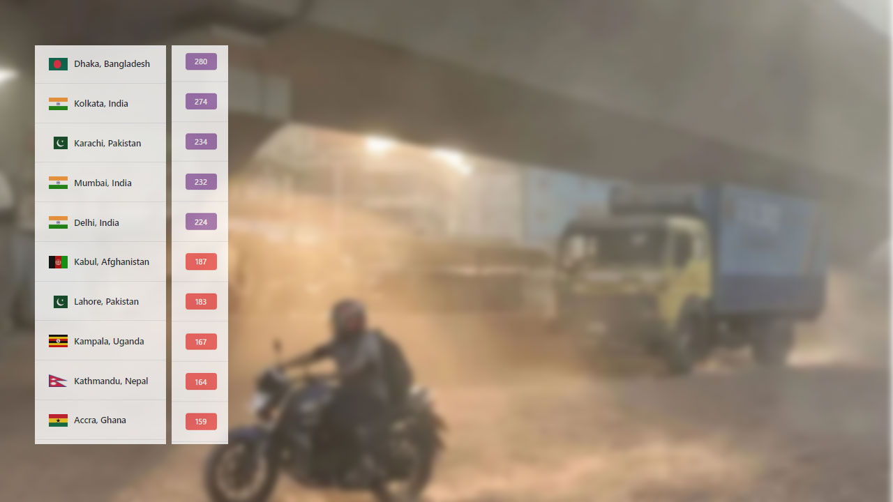 বিশ্বের দূষিত বাতাসের শহরের তালিকায় আজ সবার ওপরে রয়েছে ঢাকা। বেলা ১১টা ২০ মিনিটে এয়ার কোয়ালিটি ইনডেক্স (একিউআই) স্কোর ২৮০ নিয়ে রাজধানীর বাতাসের মান ‘খুব অস্বাস্থ্যকর’ অবস্থায় রয়েছে।