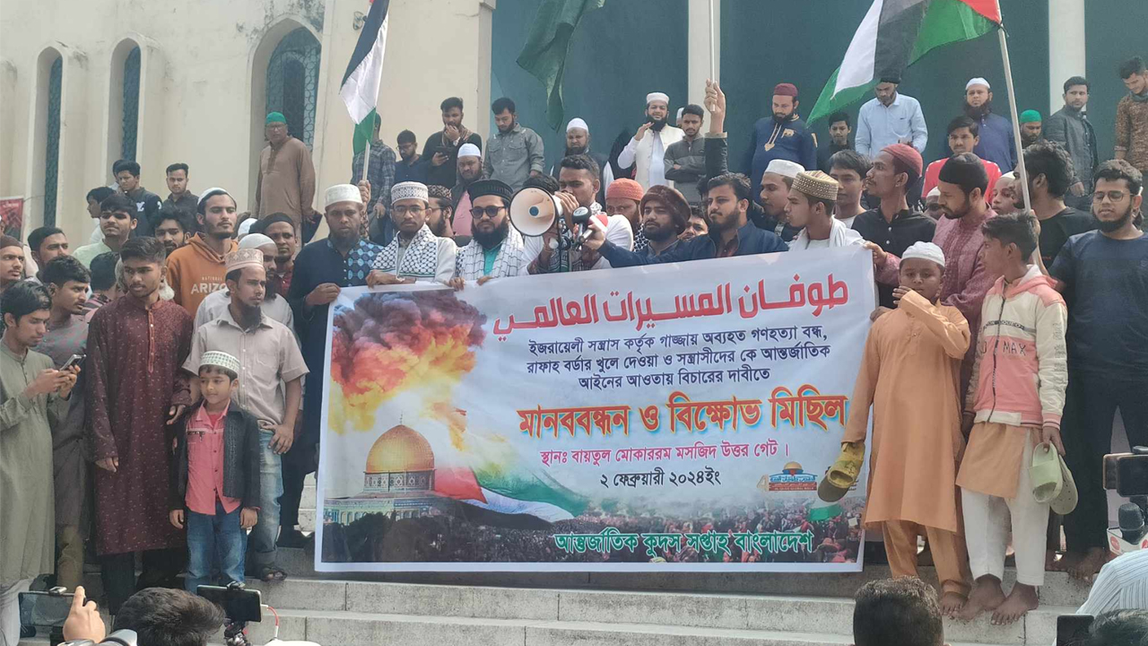শুক্রবার (২ ফেব্রুয়ারি) বায়তুল মোকাররম প্রাঙ্গণে আন্তর্জাতিক কুদস সপ্তাহ বাংলাদেশের উদ্যোগে এ মানববন্ধন অনুষ্ঠিত হয়।