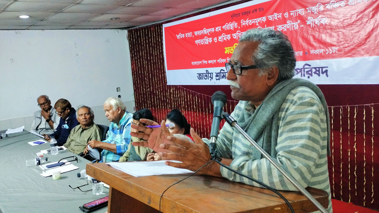 রোববার (৪ ফেব্রুয়ারি) ঢাকার তোপখানা সড়কে বাংলাদেশ শিশু কল্যাণ পরিষদ মিলনায়তনে ‘শ্রমিক হত্যা, জবরদস্তিমূলক শ্রম পরিস্থিতি, নিবর্তনমূলক আইন ও ন্যায্য মজুরি বঞ্চিত শ্রমিক : গণতান্ত্রিক ও শ্রমিক অধিকার প্রতিষ্ঠায় করণীয়’ শীর্ষক মতবিনিময় সভায় তিনি এ কথা বলেন।