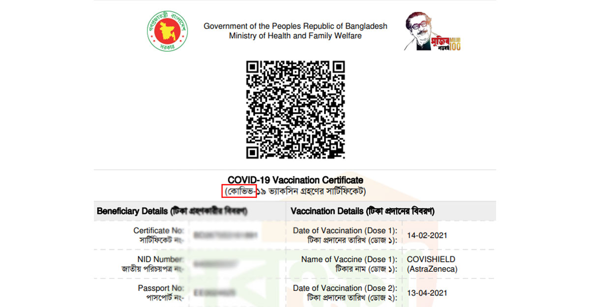 করোনাভাইরাসের দ্বিতীয় ডোজ টিকা নেওয়ার পর যে সার্টিফিকেট বা সনদপত্র দেওয়া হচ্ছে সেখানে বাংলা বানান ভুল রয়েছে। ইংরেজিতে Covid 19 লেখার নিচে বাংলায় লেখা আছে কোভিভ ১৯, সঠিক হবে কোভিড ১৯।