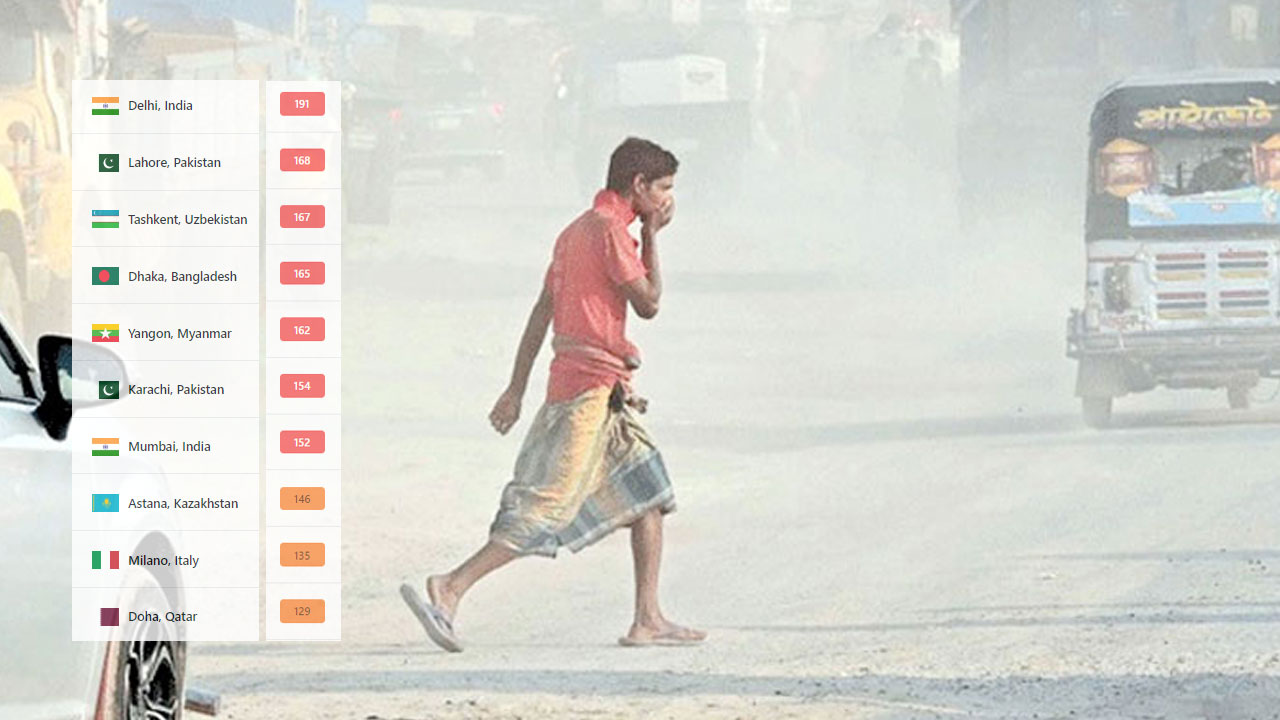 দূষণের শীর্ষে রয়েছে ভারতের রাজধানী দিল্লি। দিল্লি স্কোর ১৯১ অর্থাৎ সেখানকারও অস্বাস্থ্যকর পর্যায়ে রয়েছে। দ্বিতীয় অবস্থানে রয়েছে পাকিস্তানের লাহোর। এই শহরটির স্কোর ১৬৮ অর্থাৎ সেখানকার বায়ুও অস্বাস্থ্যকর।