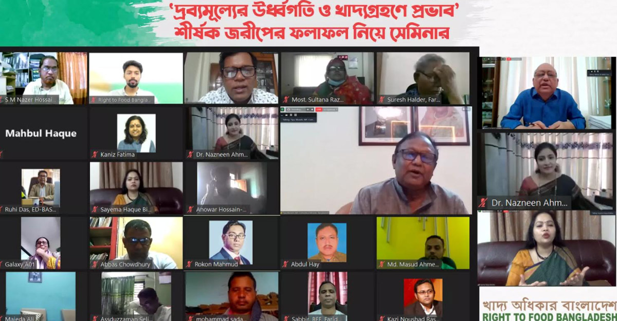 বৃহস্পতিবার (২২ এপ্রিল) সামাজিক যোগাযোগ মাধ্যমে ‘খাদ্য অধিকার বাংলাদেশ’ আয়োজিত ‘দ্রব্যমূল্যের ঊর্ধ্বগতি ও খাদ্য গ্রহণে প্রভাব’ শীর্ষক জরিপের ফলাফল নিয়ে এক ওয়েবিনারে বক্তারা এসব তথ্য জানান।