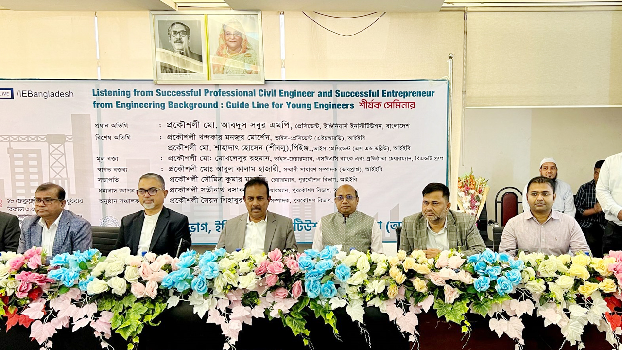 বুধবার (২৮ ফেব্রুয়ারি) ইঞ্জিনিয়ার্স ইন্সটিটিউশন, বাংলাদেশ (আইইবি)'র পুরকৌশল বিভাগের উদ্যোগে ‘প্রকৌশল পটভূমি থেকে সফল পেশাদার-তরুণ প্রকৌশলীদের জন্য ভবিষ্যতের নির্দেশনা’ শীর্ষক সেমিনারে প্রধান অতিথির বক্তব্যে আইইবির প্রেসিডেন্ট মো. আবদুস সবুর এসব কথা বলেন।