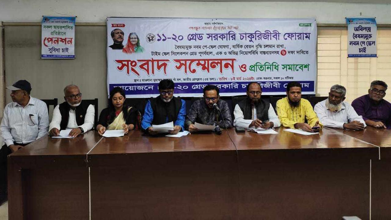 বৈষম্যমুক্ত নবম পে-স্কেল ঘোষণা, বার্ষিক বেতন বৃদ্ধি চলমান রাখাসহ ৬ দফা দাবিতে সংবাদ সম্মেলন করেছে ১১-২০ গ্রেড সরকারি চাকরিজীবী ফোরাম।