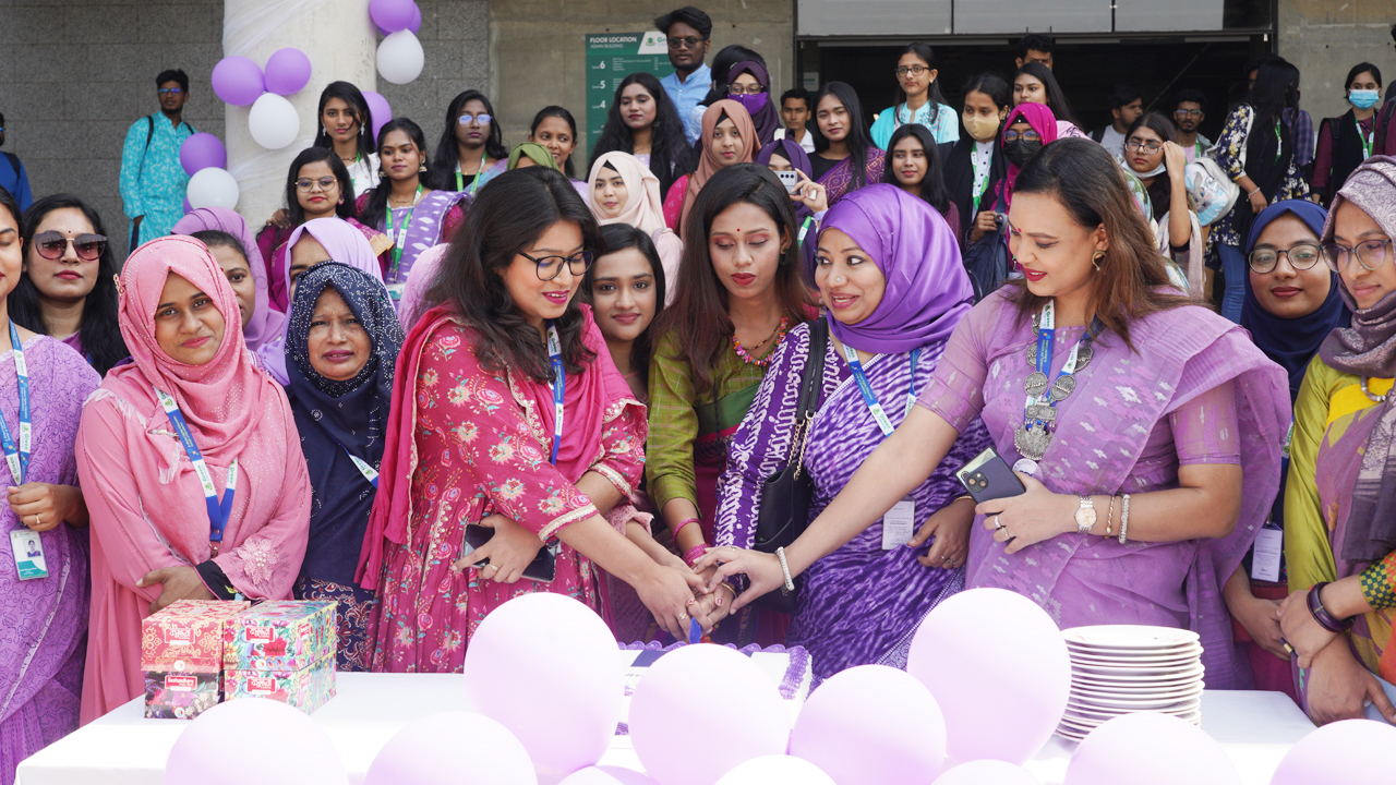 এর আগে দিনটি উদযাপনের অংশ হিসেবে বর্ণাঢ্য এক র্যালির আয়োজন করা হয়। এতে বিশেষ রঙের পোশাক পরে নারীরা অংশ নেন। নারীর পাশে দাঁড়াতে র্যালিতে পুরুষরাও সমানভাবে অংশ নেন। পরে কেক কেটে বিশেষ এই দিন উদযাপন করেন উপস্থিত শিক্ষক-শিক্ষার্থীরা।