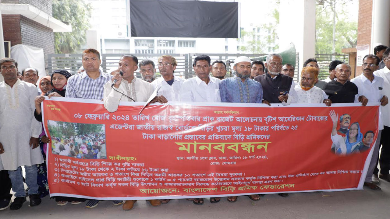 বক্তারা আরো বলেন, অসম শুল্কের ভারে বিড়ি মালিকরা কারখানা বন্ধ করতে বাধ্য হচ্ছে। ফলে বিড়ি শিল্প ও শ্রমিকদের টিকিয়ে রাখার স্বার্থে ২০২৪-২৫ অর্থবছরের বাজেটে বিড়ির শুল্ক বৃদ্ধি না করা এবং প্রতি প্যাকেট বিড়ির মূল্য ১৮ টাকা থেকে ২ টাকা কমিয়ে ১৬ টাকা করার দাবি করছি। সিগারেট ও বিড়ি একই গোত্রভুক্ত হওয়া সত্ত্বেও দুটোর মাঝে বৈষম্য বিরাজ করছে। বিড়িতে অগ্রিম আয়কর ১০ শতাংশ আর সিগারেটে ৩ শতাংশ। বিড়ি এবং সিগারেটের অগ্রিম আয়করের বৈষম্য দূর করতে হবে।