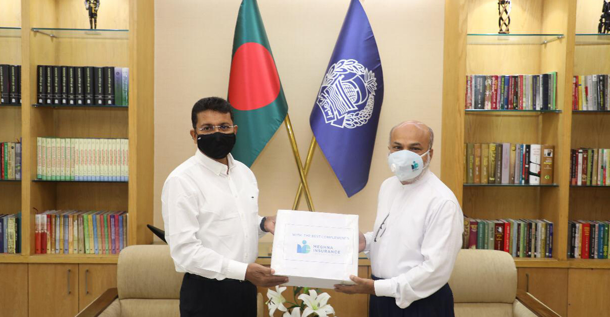 বাংলাদেশ পুলিশের ঢাকা রেঞ্জের উপ-মহাপরিদর্শক হাবিবুর রহমানের কাছে পাঁচ হাজার মাস্ক হস্তান্তর করেন মেঘনা ইন্স্যুরেন্সের প্রধান নির্বাহী কর্মকর্তা মোহাম্মদ আবু বকর সিদ্দিক।