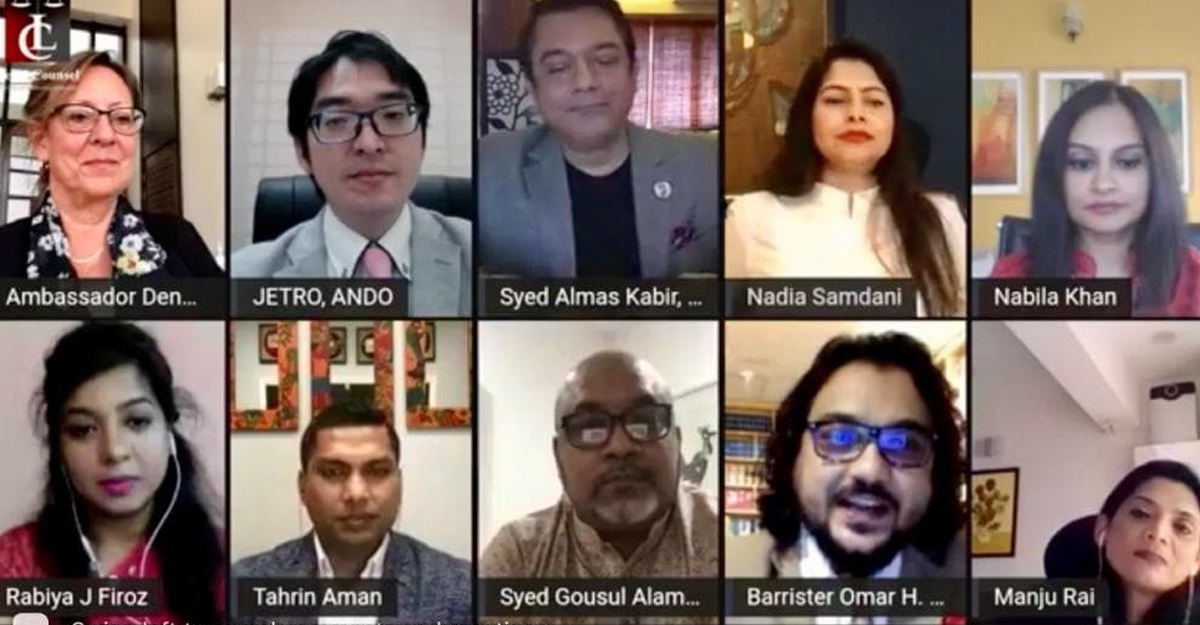 লিগ্যাল কাউন্সেলের হেড অফ চেম্বার্স ব্যারিস্টার ওমর এইচ খানের সঞ্চালনায় ওয়েবিনারের প্রধান অতিথি হিসেবে উপস্থিত ছিলেন ডেনমার্কের রাষ্ট্রদূত উইনি এস্ত্রুপ পিটারসন। সঙ্গে আলোচক হিসেবে অংশ নিয়েছেন বাংলাদেশ আসোসিয়েশন অফ সফটওয়্যার অ্যান্ড ইনফরমেশন সার্ভিসেস (বেসিস) এর সভাপতি আলমাস কবির, জাপান এক্সটার্নাল ট্রেড অর্গানাইজেশনের (জেট্রো) কান্ট্রি রিপ্রেজেন্টেটিভ ইউজি আন্দো, সামদানি আর্ট ফাউন্ডেশনের সভাপতি নাদিয়া সামদানি, নরডিক চেম্বার অফ কমার্স অ্যান্ড ইন্ডাস্ট্রিসের সভাপতি তাহরিন আমান, গ্রে অ্যাডভারটাইজিং বাংলাদেশের কান্ট্রি হেড সৈয়দ গাউসুল আলম শাওন, ইউনিলিভারের বিভাগীয় প্রধান নাবিলা জে খান ও ওয়েস্টার্ন ইউনিওনের এশিয়া প্যাসিফিক অঞ্চলের সহকারী সাধারণ উপদেষ্টা মনজু এন রায়।