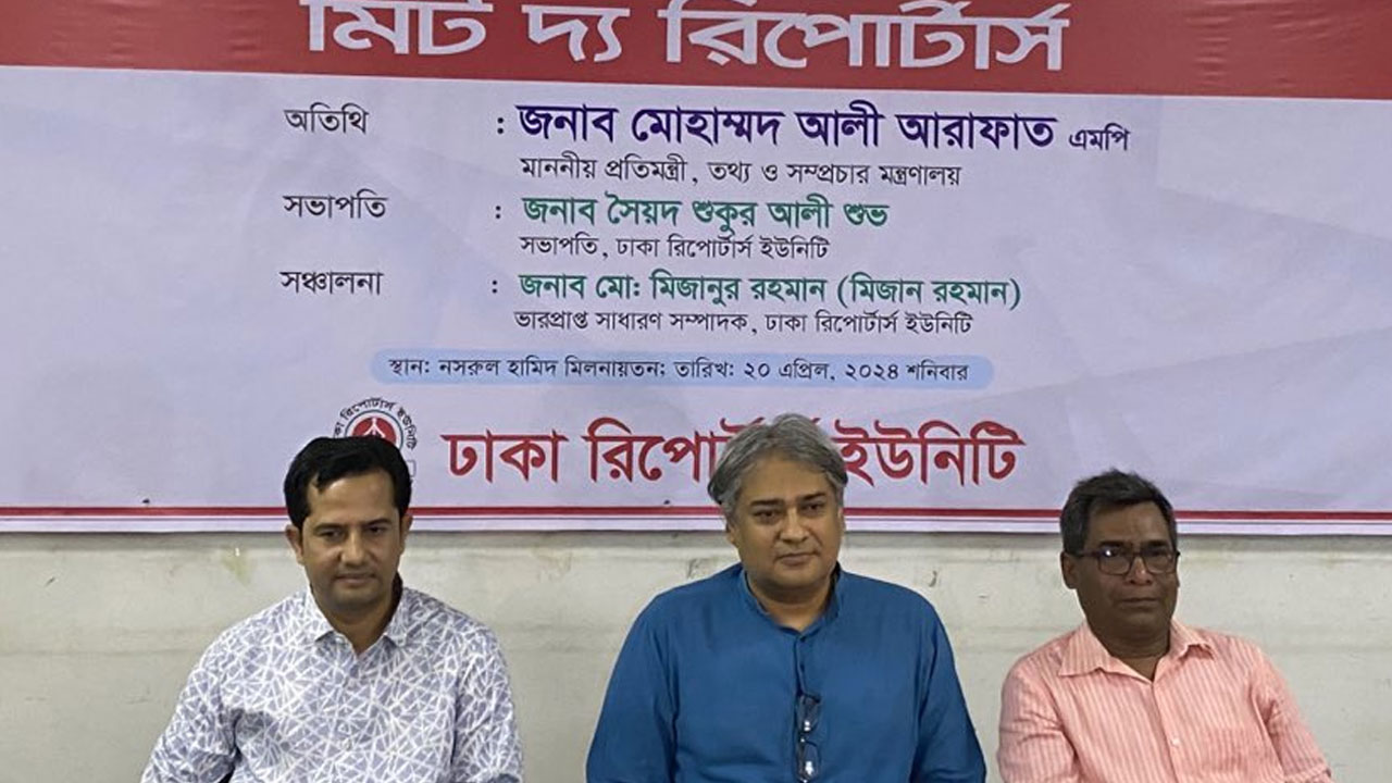 শনিবার (২০ এপ্রিল) দুপুরে রাজধানীর সেগুনবাগিচায় ঢাকা রিপোর্টার্স ইউনিটির নসরুল হামিদ মিলনায়তনে ঢাকা রিপোর্টার্স ইউনিটি আয়োজিত ‘মিট দ্য রিপোর্টার্স’ অনুষ্ঠানে তিনি একথা জানান।