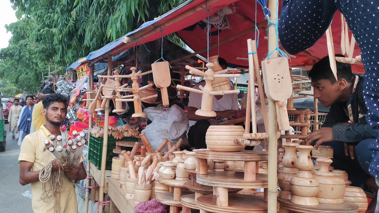 দেশের বিভিন্নপ্রান্ত থেকে মাটির তৈজসপত্র, খেলনা আর বাঁশ-বেত, মুড়ি-মুড়কি, গাছের চারা, ফুলঝাড়ু, হাতপাখাসহ নানা ধরনের গৃহস্থালি ও লোকজ বিভিন্ন পণ্য সাজিয়ে বিকিকিনি শুরু করে দিয়েছেন ব্যবসায়ীরা। মেলায় এখন পর্যন্ত সবচেয়ে বেশি এসেছে মাটির তৈরি জিনিসপত্র। মাটির তৈরি ঘর সাজানোর বিভিন্ন ধরনের আসবাব, শৌখিন জিনিসপত্র, শিশুদের খেলনার পুতুল, দা-বঁটি, ঘোড়া নিয়ে বসেছেন দোকানিরা। কাঠের তৈরি খাট, আলমিরা, আলনাসহ আরও বিভিন্ন আসবাবপত্র নিয়েও বসেছেন কয়েকজন দোকানি।