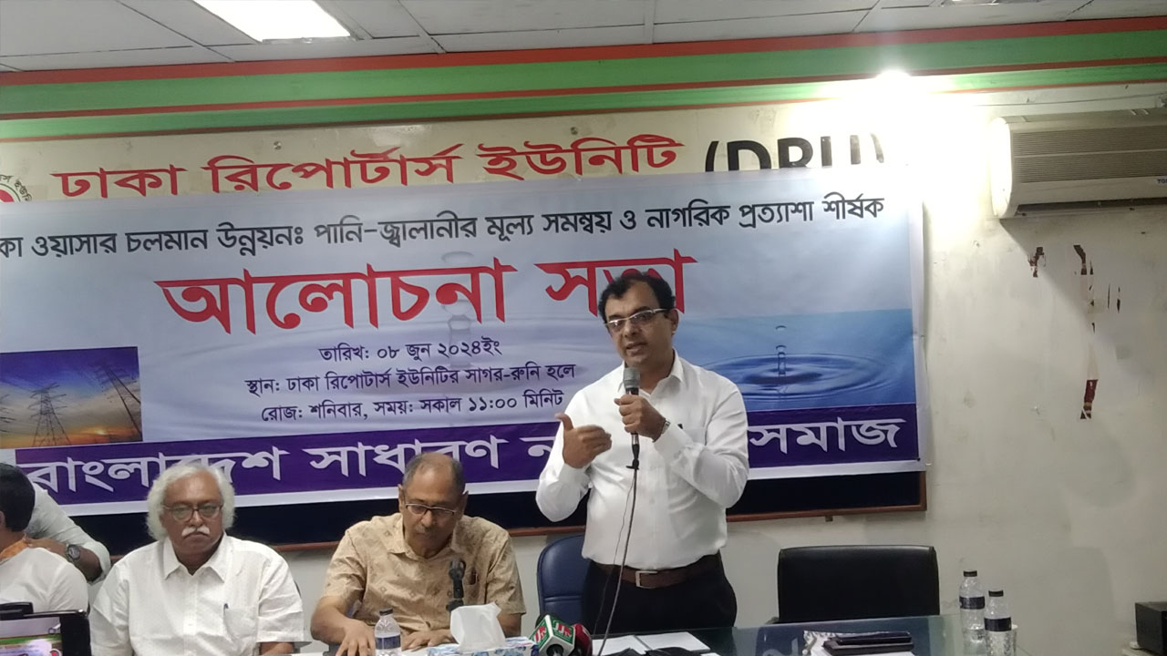 শনিবার (৮ জুন) বাংলাদেশ সাধারণ নাগরিক সমাজের উদ্যোগে ঢাকা রিপোর্টার্স ইউনিটির সাগর-রুনি মিলনায়তনে ঢাকা ওয়াসার চলমান উন্নয়ন জ্বালানি ও পানির মূল্য সমন্বয় নাগরিকদের প্রত্যাশা শীর্ষক এক আলোচনা সভায় তিনি এ কথা বলেন।