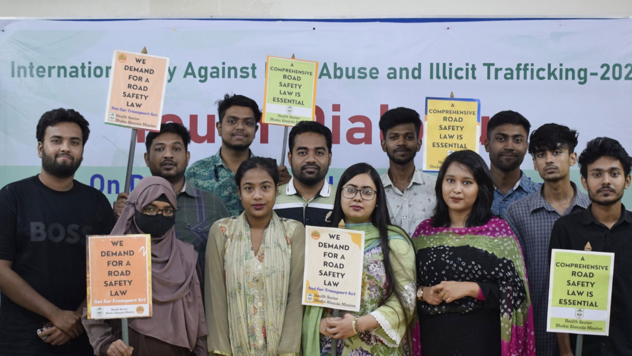 মাদকের অপব্যবহার ও পাচার বিরোধী আন্তর্জাতিক দিবস ২০২৪ উদযাপন উপলক্ষ্যে বৃহস্পতিবার (২৭ জুন) বেলা সাড়ে ১১টায় রাজধানীর শ্যামলিতে ঢাকা আহ্ছানিয়া মিশন স্বাস্থ্য সেক্টরের সহযোগিতায় আহছানিয়া মিশন ইয়ুথ ফোরাম ফর হেলথ অ্যান্ড ওয়েলবিংয়ের আয়োজনে স্বাস্থ্য সেক্টরের সভাকক্ষে নিরাপদ সড়ক সংক্রান্ত তরুণদের দাবি নিয়ে সাংবাদিকদের সঙ্গে মতবিনিময় সভায় এ দাবি জানায় তরুণরা।