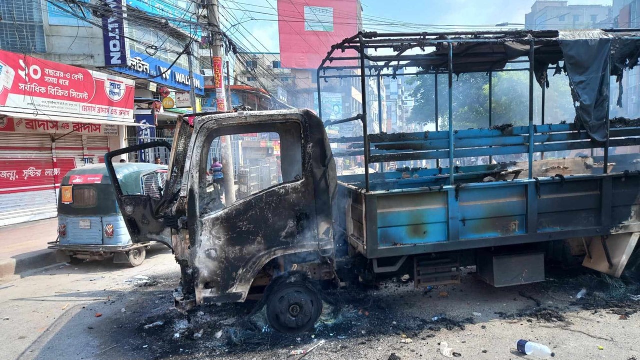 ঢাকা মেট্রোপলিটন পুলিশের (ডিএমপি) একটি পিকআপ ভ্যান গাড়িতে আগুন দিয়েছে কোটা আন্দোলনকারীরা।