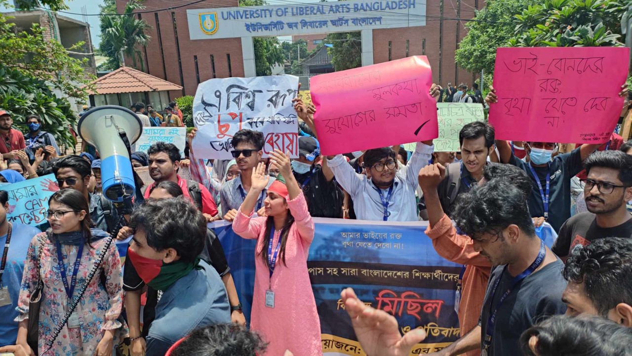 চলমান কোটা সংস্কার আন্দোলনে শিক্ষার্থীদের ওপর হামলার প্রতিবাদে সারা দেশে পালিত হচ্ছে কমপ্লিট শাটডাউন কর্মসূচি। তারই ধারাবাহিকতায় বৃহস্পতিবার সকাল থেকে রাজপথে অবস্থান নিয়েছেন ইউনিভার্সিটি অব লিবারেল আর্টসের (ইউল্যাব) শিক্ষার্থীরা।