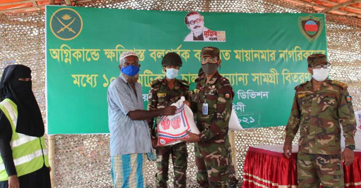 দশ হাজারেরও বেশি রোহিঙ্গার মাঝে ১০০ মেট্রিক টন চাল ও অন্যান্য দৈনন্দিন ব্যবহার্য সামগ্রী বিতরণ করেছে বাংলাদেশ সেনাবাহিনী। সম্প্রতি রোহিঙ্গা ক্যাম্পে ঘটে যাওয়া অগ্নিকাণ্ডে ক্ষতিগ্রস্ত রোহিঙ্গা পরিবারগুলোকে এ সহায়তা দেওয়া হয়।