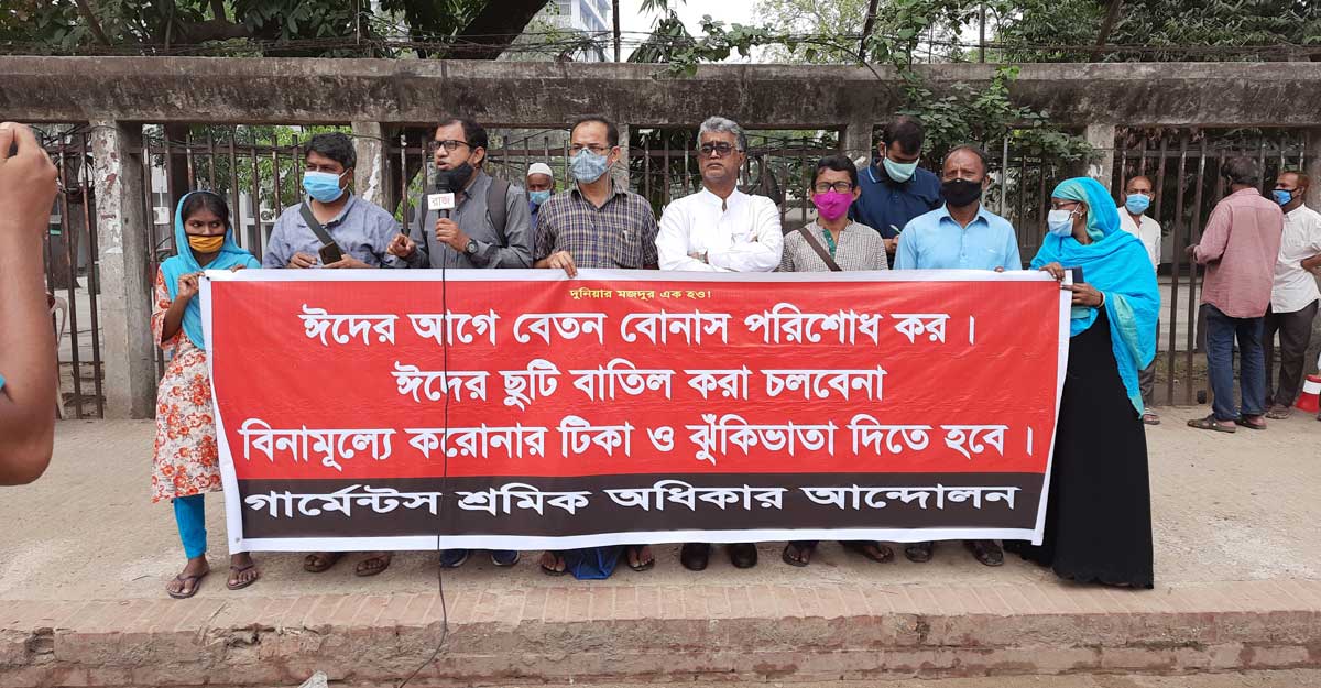 ঈদের আগে গার্মেন্টস শ্রমিকদের বকেয়া বেতন ও বোনাস পরিশোধের দাবি জানিয়েছেন গার্মেন্টস শ্রমিক অধিকার আন্দোলন সংগঠনের নেতারা। এ সময় তারা করোনাকালে ঝুঁকিভাতা, খাদ্য, রেশন ও বিনামূল্যে চিকিৎসা দেওয়ার দাবিও তুলে ধরেন।