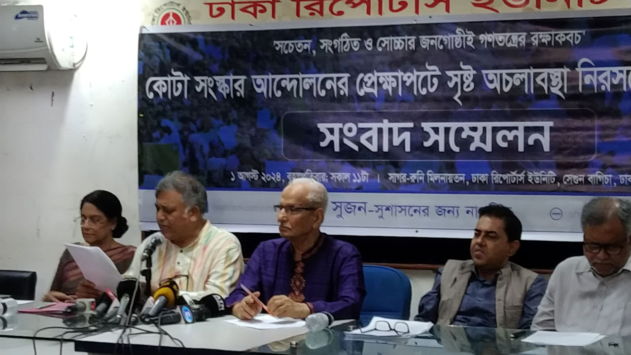 বৃহস্পতিবার (১ আগস্ট) ঢাকা রিপোর্টার্স ইউনিটির সাগর রুনি মিলনায়তনে কোটা সংস্কার আন্দোলনের প্রেক্ষাপটে সৃষ্ট অচলাবস্থা নিরসনের দাবিতে সুশাসনের জন্য নাগরিক (সুজন) আয়োজিত এক সংবাদ সম্মেলনে এ কথা বলা হয়।