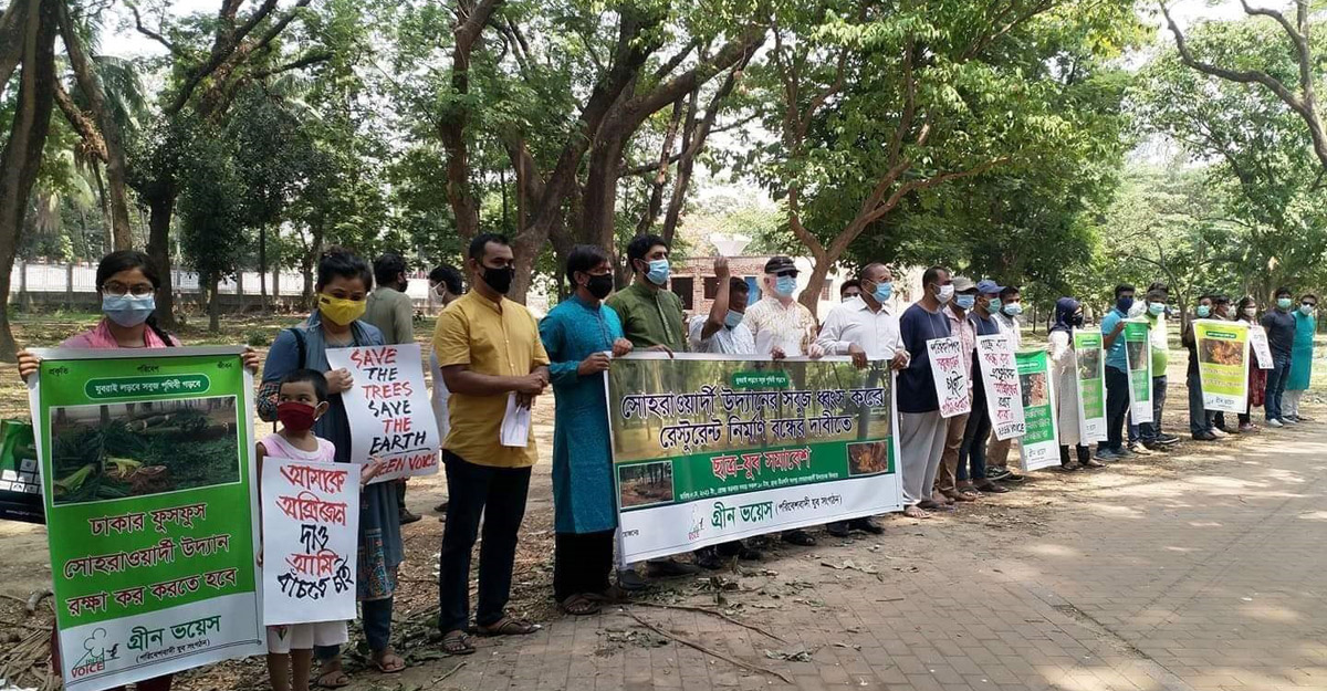 সোহরাওয়ার্দী উদ্যানের সবুজ ধ্বংস করে রেস্টুরেন্ট নির্মাণ বন্ধ করা এবং বৃক্ষনিধনের সঙ্গে সংশ্লিষ্টদের শাস্তি দেওয়াসহ ৫ দফা দাবি জানিয়েছে পরিবেশবাদী যুব সংগঠন গ্রীন ভয়েস। শুক্রবার (৭ মে) রাজধানীর সোহরাওয়ার্দী উদ্যানে আয়োজিত এক মানববন্ধন থেকে সংগঠনটি এসব দাবি জানায়।