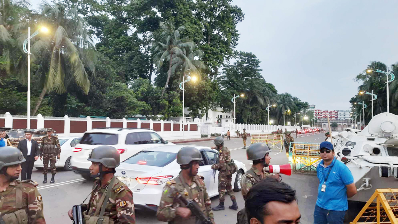 প্রধান ফটকে দেখা গেছে, বঙ্গবভনে প্রবেশর জন্য আসা আমন্ত্রিত অতিথিদের আমন্ত্রণপত্র দেখে ভেতরে প্রবেশ করতে দিচ্ছেন সেনা সদস্যরা।