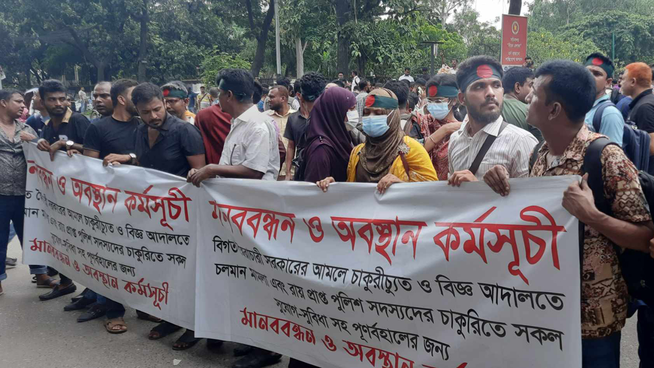 আওয়ামী সরকারের আমলে চাকরিচ্যুত এবং আদালতে মামলা চলমান ও রায়প্রাপ্তদের চাকরিতে সব সুযোগ-সুবিধাসহ পুনর্বহালের দাবিতে মানববন্ধন করছেন বিভিন্ন সময়ে চাকরিচ্যুত পুলিশ সদস্যরা।