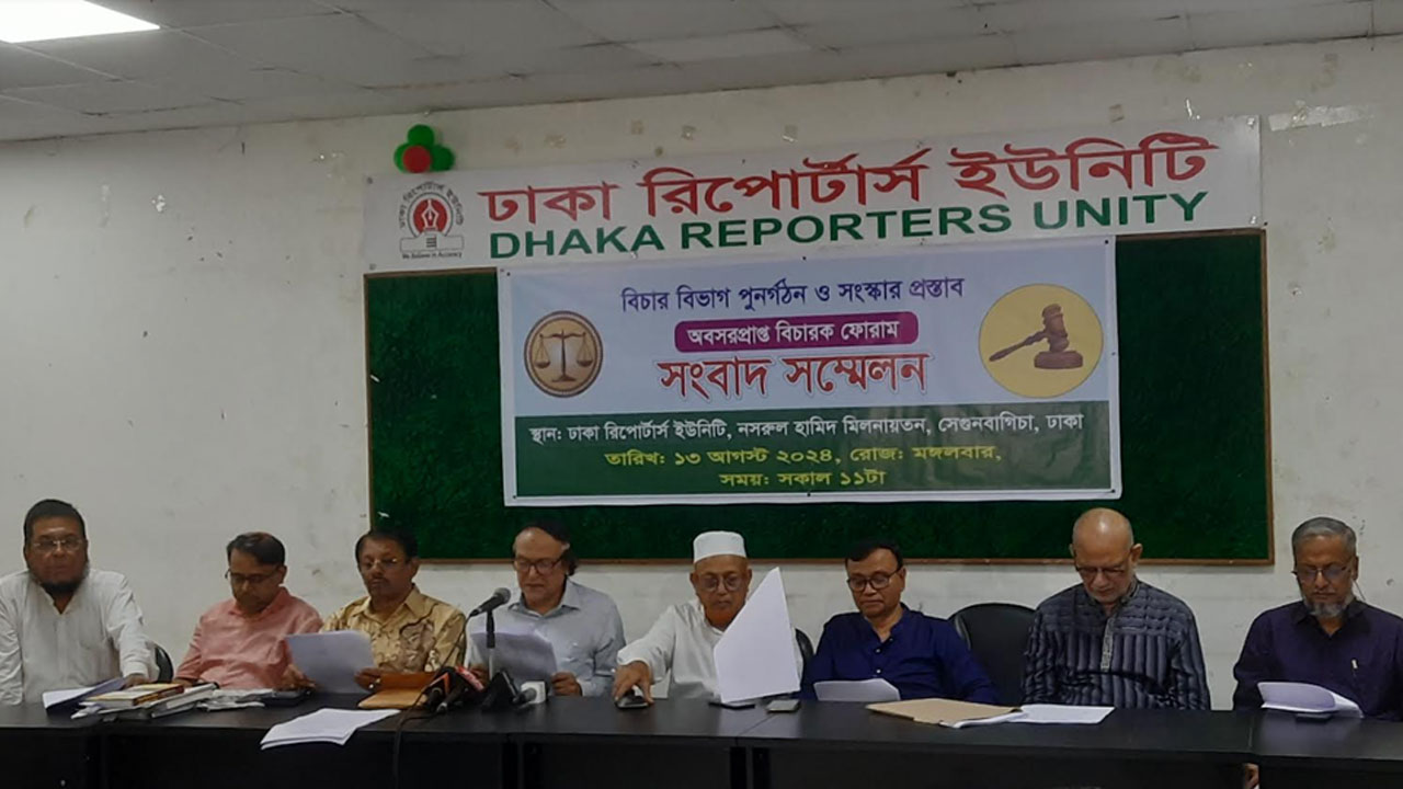 মঙ্গলবার (১৩ আগস্ট) ঢাকা রিপোর্টার্স ইউনিটির নসরুল হামিদ মিলনায়তনে সংবাদ সম্মেলনে সংগঠনটির নেতারা এমন দাবি জানিয়েছেন। এ সময় দেশের বিচার বিভাগ পুনর্গঠন ও সংস্কার করতে অসরপ্রাপ্ত বিচারক ফোরামের পক্ষ থেকে ১২ দফা প্রস্তাবও তুলে ধরা হয়েছে।