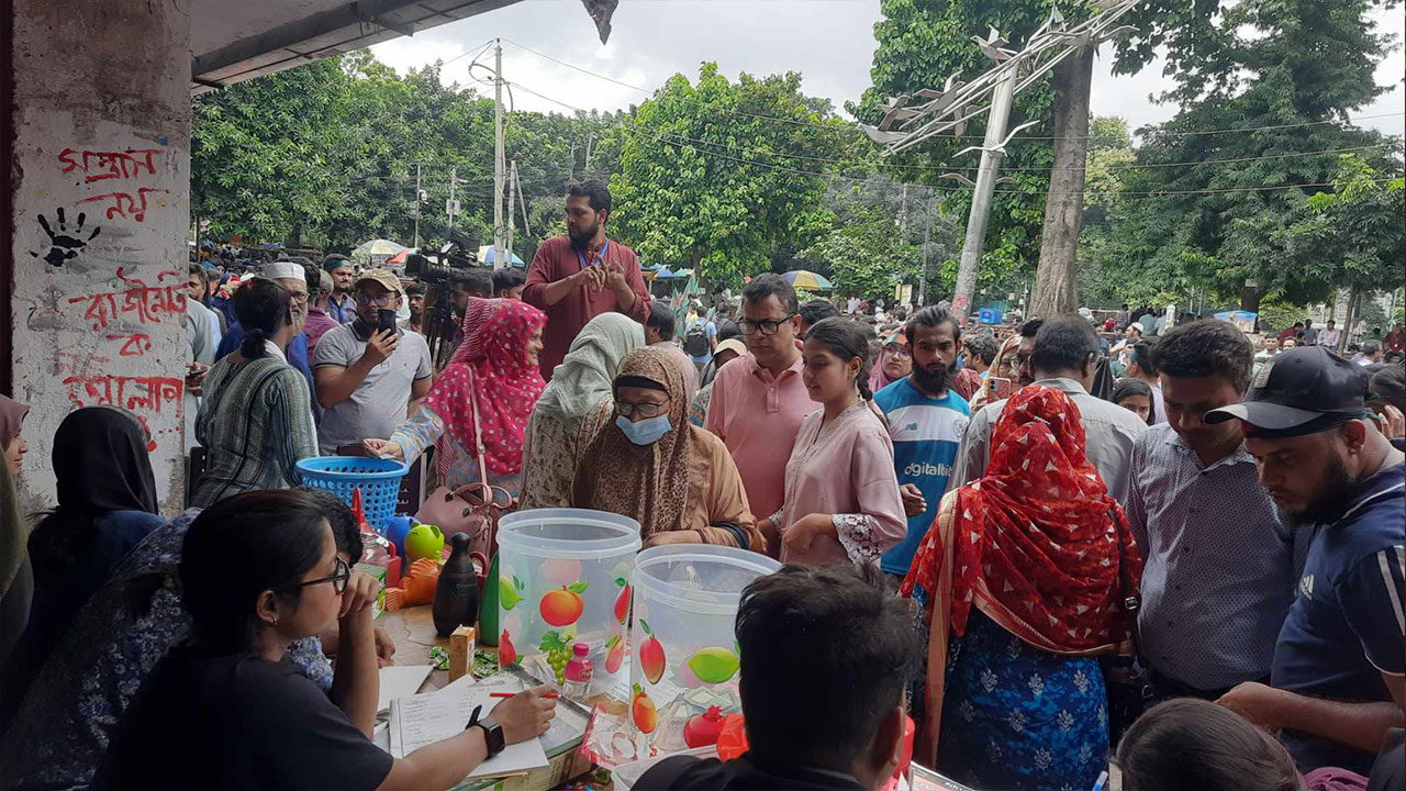 টিএসসিতে পঞ্চম দিনের মতো চলছে গণত্রাণ সংগ্রহ