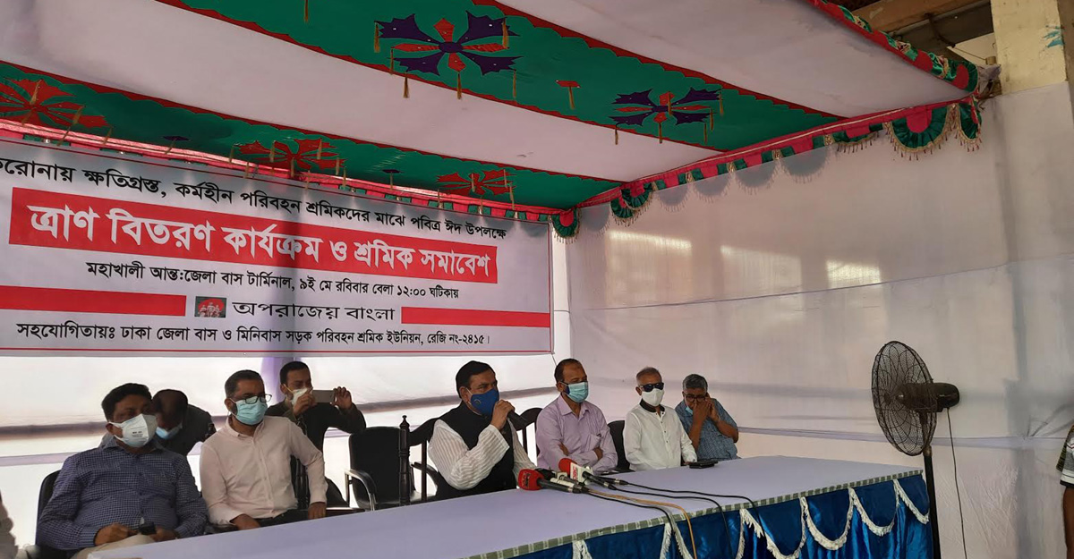 রোববার (৯ মে) মহাখালী বাস টার্মিনালে করোনায় ক্ষতিগ্রস্ত কর্মহীন পরিবহন শ্রমিকদের মধ্যে পবিত্র ঈদুল ফিতর উপলক্ষে ত্রাণ বিতরণ কার্যক্রম ও শ্রমিক সমাবেশে তিনি এসব কথা বলেন। অপরাজেয় বাংলা নামে একটি সংগঠনের আয়োজনে এ কার্যক্রমের সহযোগিতা করে ঢাকা জেলা বাস ও মিনিবাস সড়ক পরিবহন শ্রমিক ইউনিয়ন।