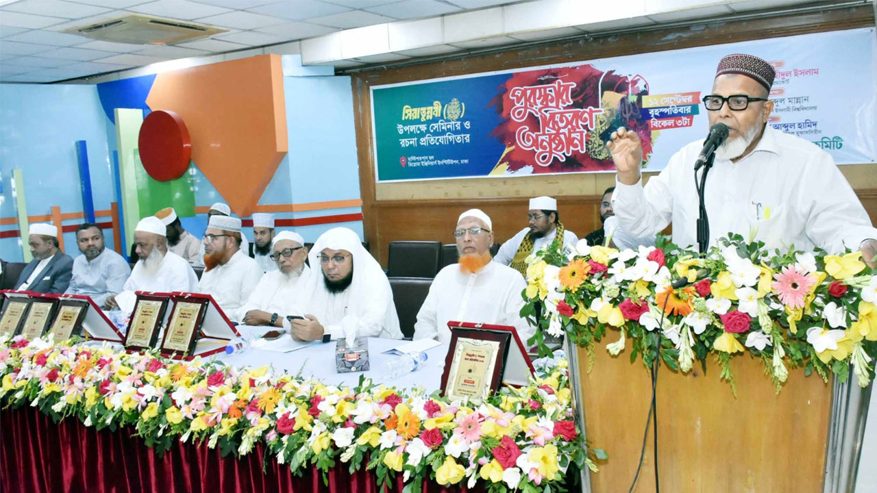 জাতীয় সীরাত উদযাপন কমিটির উদ্যোগে আজ (বৃহস্পতিবার) রাজধানীর ডিপ্লোমা ইঞ্জিনিয়ার্স ইনস্টিটিউশনের মাল্টিপারপাস হলে সিরাতুন্নবী (সা:) উপলক্ষ্যে সিরাত সেমিনার ও রচনা প্রতিযোগিতার পুরস্কার বিতরণ অনুষ্ঠানে প্রধান অতিথির বক্তব্যে একথা বলেন তিনি।