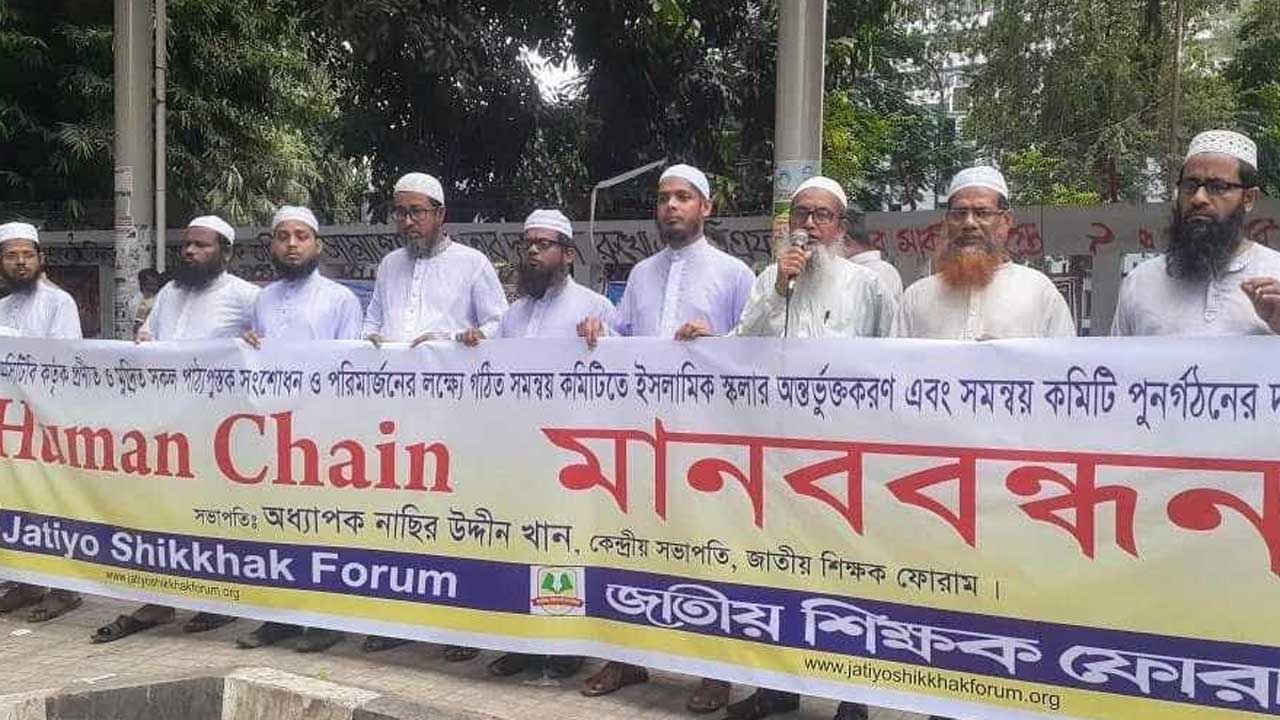 এনসিটিবি কর্তৃক প্রণীত ও মুদ্রিত সব পাঠ্যপুস্তক সংশোধন ও পরিমার্জনের লক্ষ্যে গঠিত সমন্বয় কমিটিতে ইসলামিক স্কলার অন্তর্ভুক্তকরণের দাবিতে মানববন্ধন করেছে জাতীয় শিক্ষক ফোরাম।