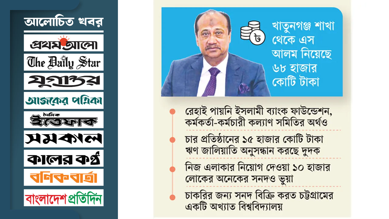 এছাড়া ৯ ব্যাংকের চলতি হিসাবে ঘাটতি ১৮ হাজার কোটি; মানবতাবিরোধী অপরাধ করলে রাজনৈতিক দল নিষিদ্ধের প্রস্তাব; পাঠ্যবই সংশোধন কমিটিতে বিশেষজ্ঞ না রাখায় ক্ষোভ; অনিশ্চয়তার মুখে সরকারি কর্মচারীদের বেতন-ভাতা; অস্থিরতার ধাক্কা লেগেছে পাহাড়ি অর্থনীতিতেও—সংবাদগুলো বিশেষ গুরুত্ব পেয়েছে।