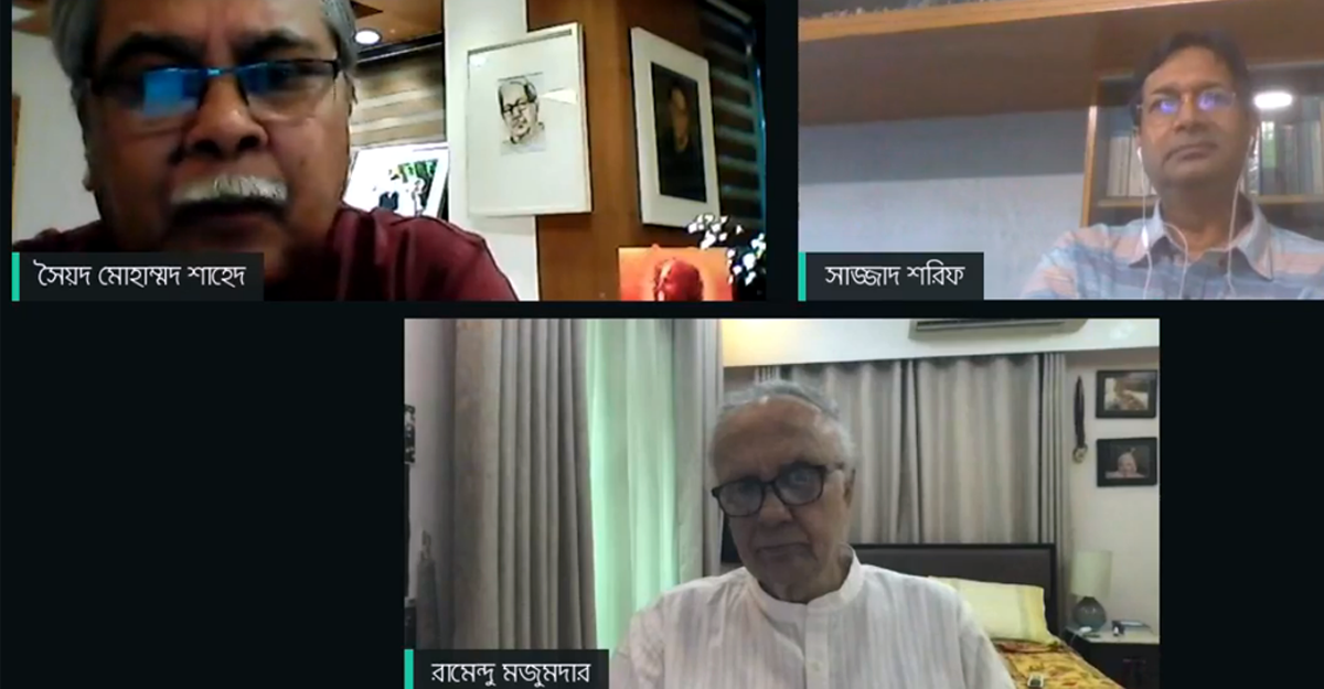 ‘বিপুলা পৃথিবীর আনিসুজ্জামান’ অনুষ্ঠানে নাট্যব্যক্তিত্ব রামেন্দু মজুমদার, কবি সাজ্জাদ শরিফ ও অধ্যাপক সৈয়দ মোহাম্মদ শাহেদ