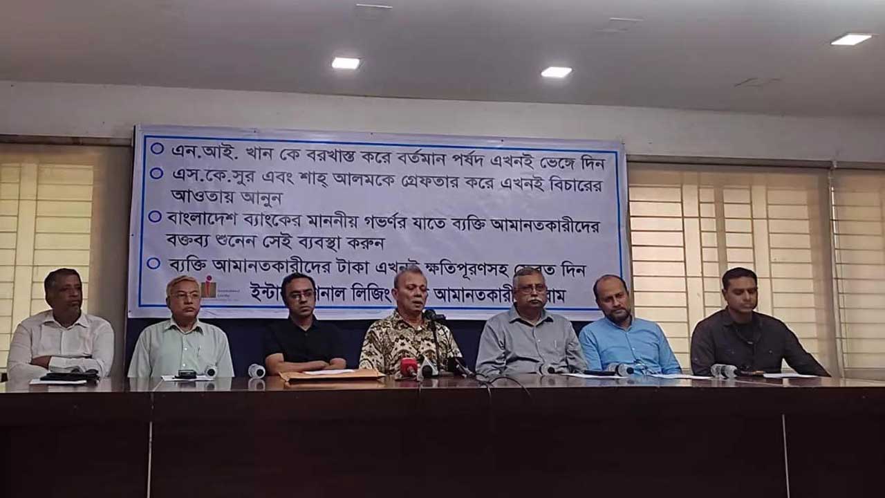 তাদের দাবিগুলো হলো- এন আই খানকে বরখাস্ত করে বর্তমান পর্ষদ এখনই ভেঙ্গে দিতে হবে, এস কে সুর এবং শাহ আলমকে গ্রেপ্তার করে এখনই বিচারের আওতায় আনতে হবে, বাংলাদেশ ব্যাংকের গভর্নর যাতে ব্যক্তি আমানতকারীদের বক্তব্য শোনেন সেই ব্যবস্থা করতে হবে এবং ব্যক্তি আমানতকারীদের টাকা এখনই ক্ষতিপূরণসহ ফেরত দিতে হবে।