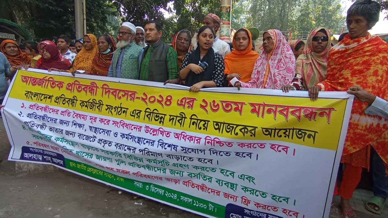 মঙ্গলবার (৩ ডিসেম্বর) জাতীয় প্রেস ক্লাবের সামনে সংগঠনটি আয়োজিত মানববন্ধন থেকে এ দাবি জানানো হয়। ২৬তম প্রতিবন্ধী দিবস-২০২৪ উপলক্ষ্যে এই মানববন্ধনের আয়োজন করা হয়।