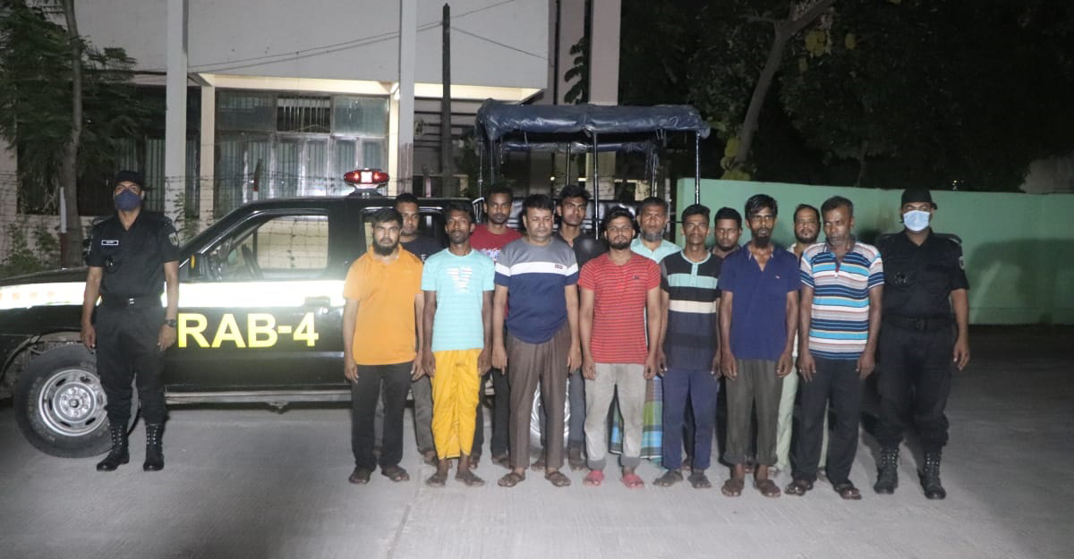 আটকরা হলেন- মো. মাহবুব আলম (৪৫), মো. নূরনবী শেখ (৩৮), মো. বাশার (২৪), মো. বেলাল হোসেন (১৯), মো. আল আমিন (২৯), মো. বাদল (১৯), মো. বেল্লাল হোসেন মন্ডল (৪৬), মো. শাওন (২০), কাজী মো. আশরাফ উদ্দিন (৬০), মো. সোহরাব (৩৫), মো. আজাহার (৪৫), অন্তর মালাকার (৩২) ও নুর সায়েদ ওরফে রুবেল (২৬)।