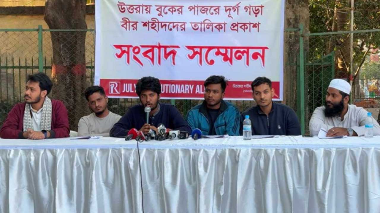 শনিবার (৭ ডিসেম্বর) এক সংবাদ সম্মেলনে জুলাই রেভল্যুশনারি অ্যালায়েন্স নামের একটি সংগঠন এ তথ্য জানায়। উত্তরার ফ্রেন্ডস ক্লাব মাঠে আয়োজিত সংবাদ সম্মেলনে লিখিত বক্তব্য পড়ে শোনান সংগঠনের মুখপাত্র ফান্তাসির মাহমুদ। এ সময় উপস্থিত ছিলেন সংগঠনের আহ্বায়ক সালেহ মাহমুদ রায়হান, সদস্যসচিব ফয়সাল মাহমুদ, যুগ্ম আহ্বায়ক আহমদ সামরান এবং উত্তরায় ১০ জন শহীদের স্বজনেরা।