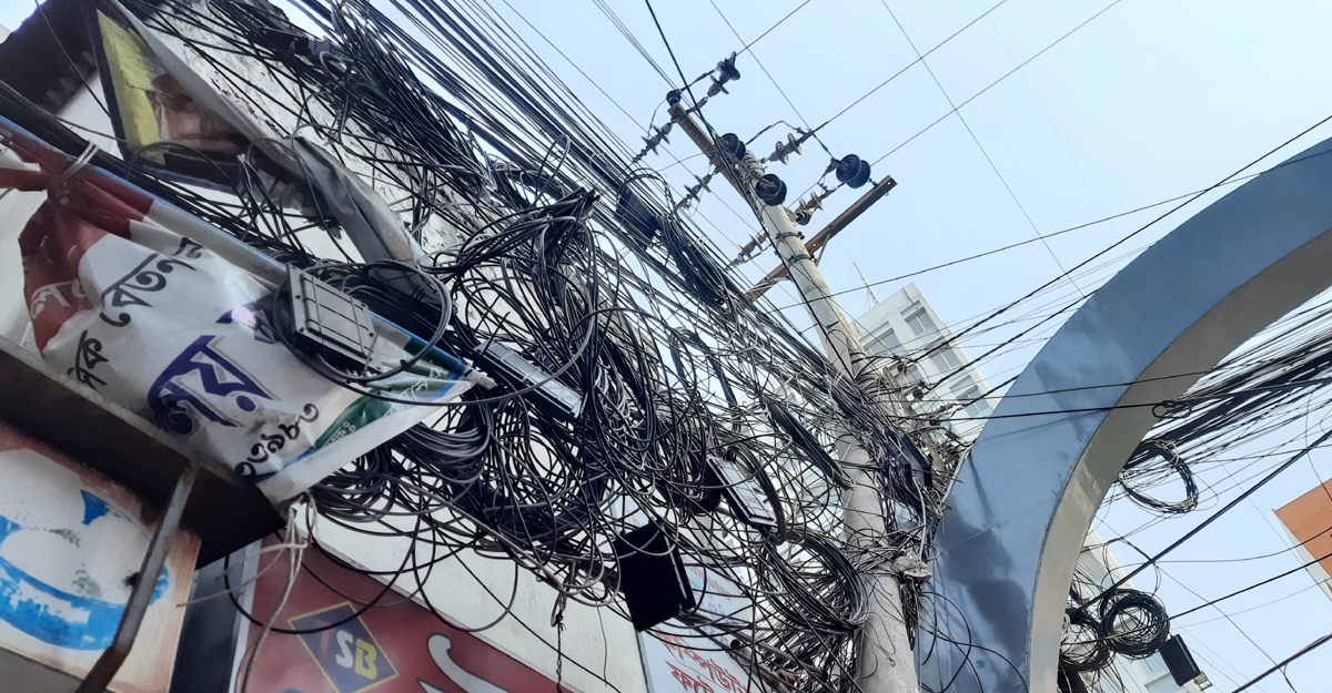 রাজধানীর বেশিরভাগ এলাকায় এখনও ঝুলন্ত তারের জঞ্জাল রয়েই গেছে/ ছবি: ঢাকা পোস্ট