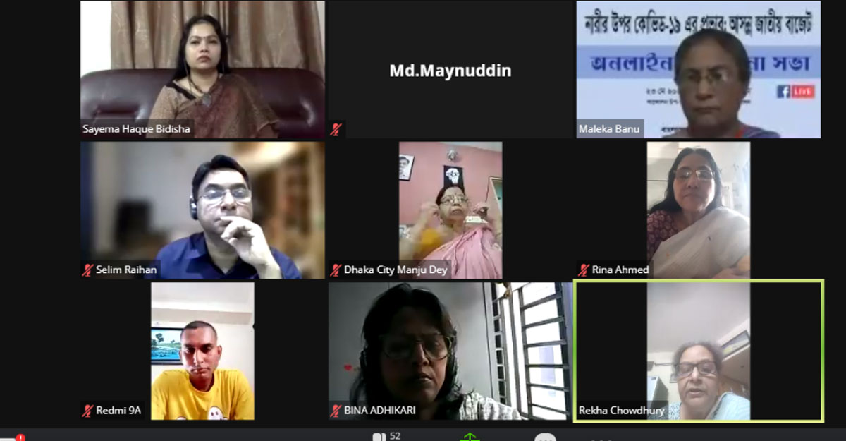 বাংলাদেশ মহিলা পরিষদের কেন্দ্রীয় কমিটির উদ্যোগে ‘নারীর উপর কোভিড- ১৯ এর প্রভাব এবং আসন্ন জাতীয় বাজেট’ বিষয়ক অনলাইন আলোচনা সভা। রোববার (২৩ মে) বেলা ১১টায় শুরু হওয়া সভায় এসব কথা বলেন আলোচকরা।