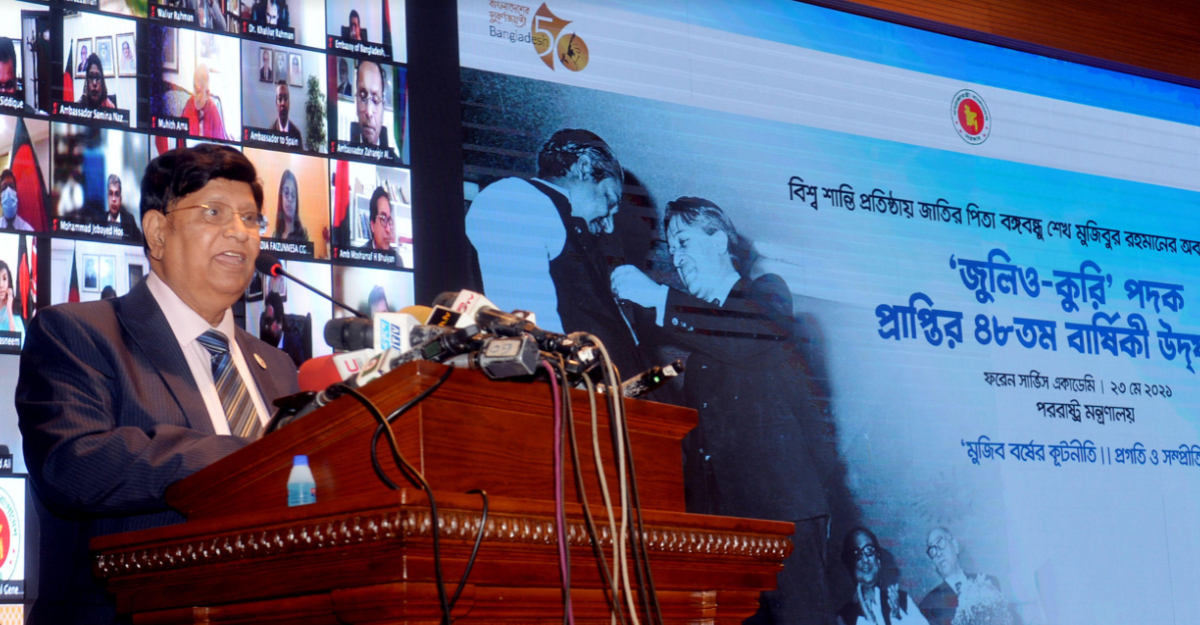 রোববার (২৩ মে) রাজধানীর ফরেন সার্ভিস একাডেমিতে বঙ্গবন্ধু শেখ মুজিবুর রহমানের জুলিও কুরি পদক প্রাপ্তির ৪৮তম বার্ষিকী উদযাপন উপলক্ষে এক আলোচনা সভায় এসব তথ্য জানান পররাষ্ট্রমন্ত্রী ড. এ কে আব্দুল মোমেন।