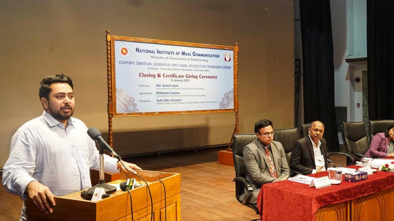 সোমবার (৬ জানুয়ারি) জাতীয় গণমাধ্যম ইনস্টিটিউটে কনটেন্ট ক্রিয়েশন, স্ক্রিন প্লে অ্যান্ড ভিজ্যুয়াল প্রোডাকশন টেকনিকস বিষয়ক প্রশিক্ষণ পাঠ্যধারার সমাপন ও সনদ বিতরণ অনুষ্ঠানে তিনি এ কথা বলেন।