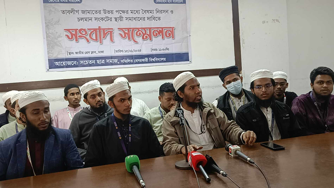 সংবাদ সম্মেলনে লিখিত বক্তব্য দেন ইস্ট ওয়েস্ট ইউনিভার্সিটির কম্পিউটার সায়েন্স বিভাগের ছাত্র জহিরুল ইসলাম। তিনি বলেন, তাবলিগ জামাত, যা মুসলিম উম্মাহর ঐক্যের প্রতীক এবং সারা বিশ্বে ইসলামের দাওয়াহ কার্যক্রমের অন্যতম মাধ্যম। এ ইবাদতকে ঘিরে সাম্প্রতিক বছরগুলোতে তাবলিগ জামাতের অভ্যন্তরীণ বিভেদ সংঘর্ষে রূপ নিয়েছে, যার ফলশ্রুতিতে প্রাণহানির মতো দুঃখজনক ঘটনা ঘটেছে। এ ঘটনা তাবলিগ জামাত নয়, বৃহত্তর মুসলিম সমাজের ঐক্য ও সৌহার্দ্যকেও প্রশ্নবিদ্ধ করছে। আমরা পর্যবেক্ষণ করছি যে তাবলিগ জামাতের বিবদমান পক্ষগুলোর মধ্যে একপক্ষ চরম বৈষম্যের শিকার হচ্ছে। তাই আমরা সেই বৈষম্যের দূর করতে সম্মিলিত প্রচেষ্টার উদ্যোগ গ্রহণ করেছি।