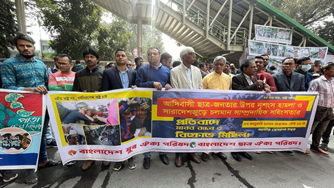 ক্ষুদ্র নৃগোষ্ঠী ছাত্র-জনতার ওপর হামলা ও সারাদেশ জুড়ে চলমান সাম্প্রদায়িক সহিংসতার প্রতিবাদ জানিয়েছে বাংলাদেশ যুব ঐক্য পরিষদ, বাংলাদেশ ছাত্র ঐক্য পরিষদ এবং উত্তরবঙ্গ আদিবাসী ফোরাম।