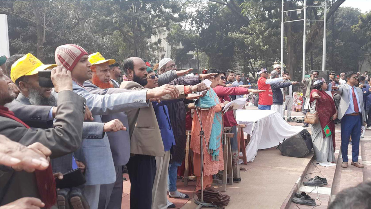 সমাবেশে শপথ বাক্য পাঠ করান— ফরিদপুরের বোয়ালমারী ভিমপুর সরকারি প্রাথমিক বিদ্যালয়ের শিক্ষক মাজেদুল হক বাবুল।