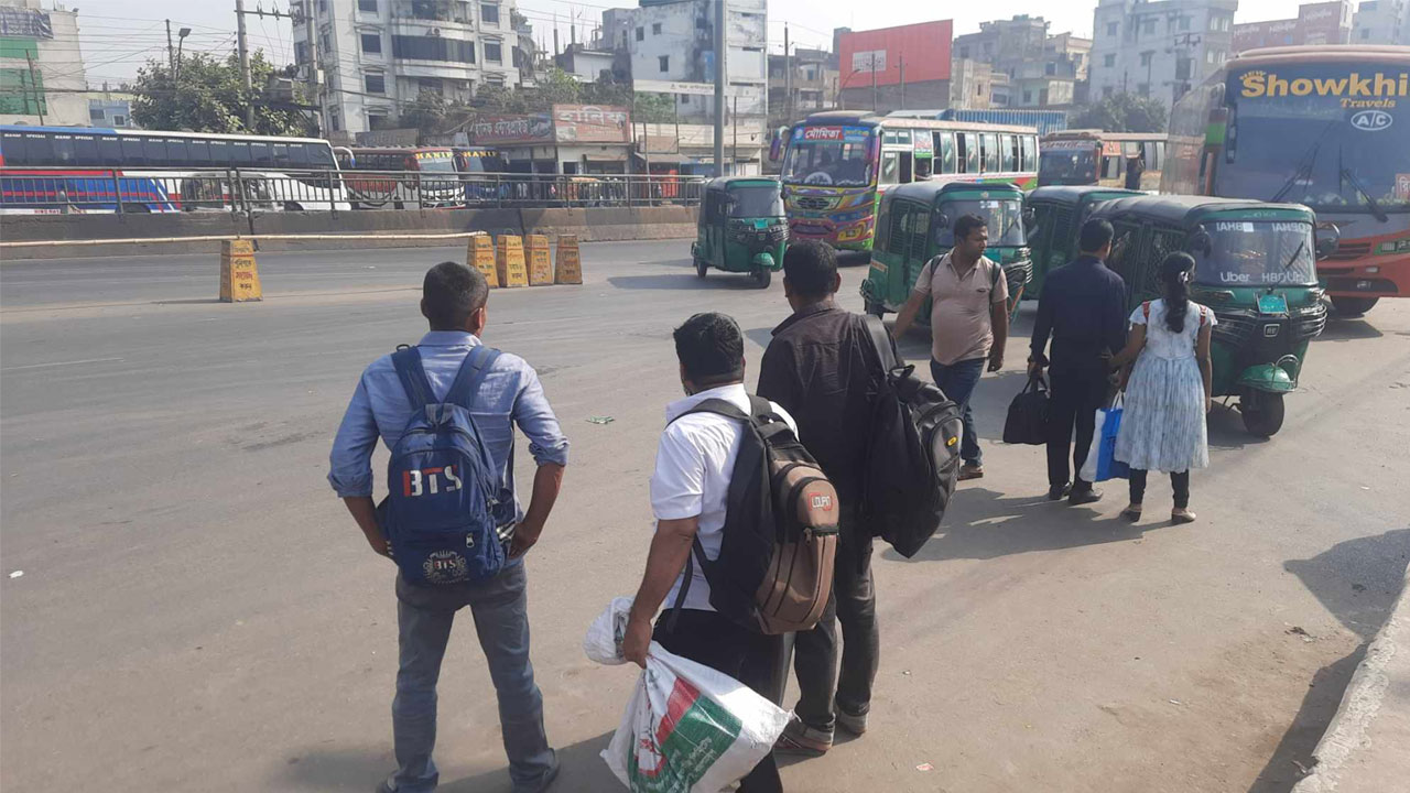 নওগাঁ যাওয়ার জন্য গাবতলী মো. সাকিল আহমেদ ও তার ভাই সকাল ৮টার দিকে টার্মিনালে এলেও টিকিট পাচ্ছেন না। নিয়মিতভাবে হানিফ পরিবহনে চলাচল করলেও আজ হানিফের টিকিট পাচ্ছেন না। অন্যান্য নন-ব্যান্ড বাসগুলো ৬৫০ টাকার ভাড়া ৯০০ টাকা চাচ্ছে বলেও তিনি অভিযোগ করেন।