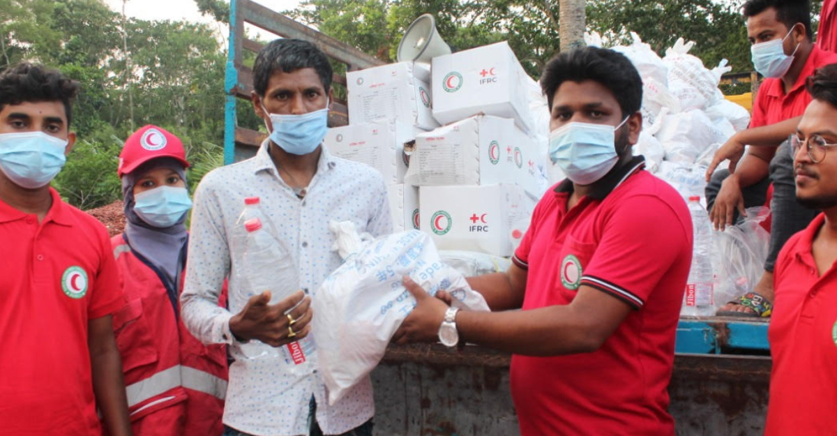খাদ্যসামগ্রী বিতরণ করছেন রেড ক্রিসেন্ট স্বেচ্ছাসেবীরা