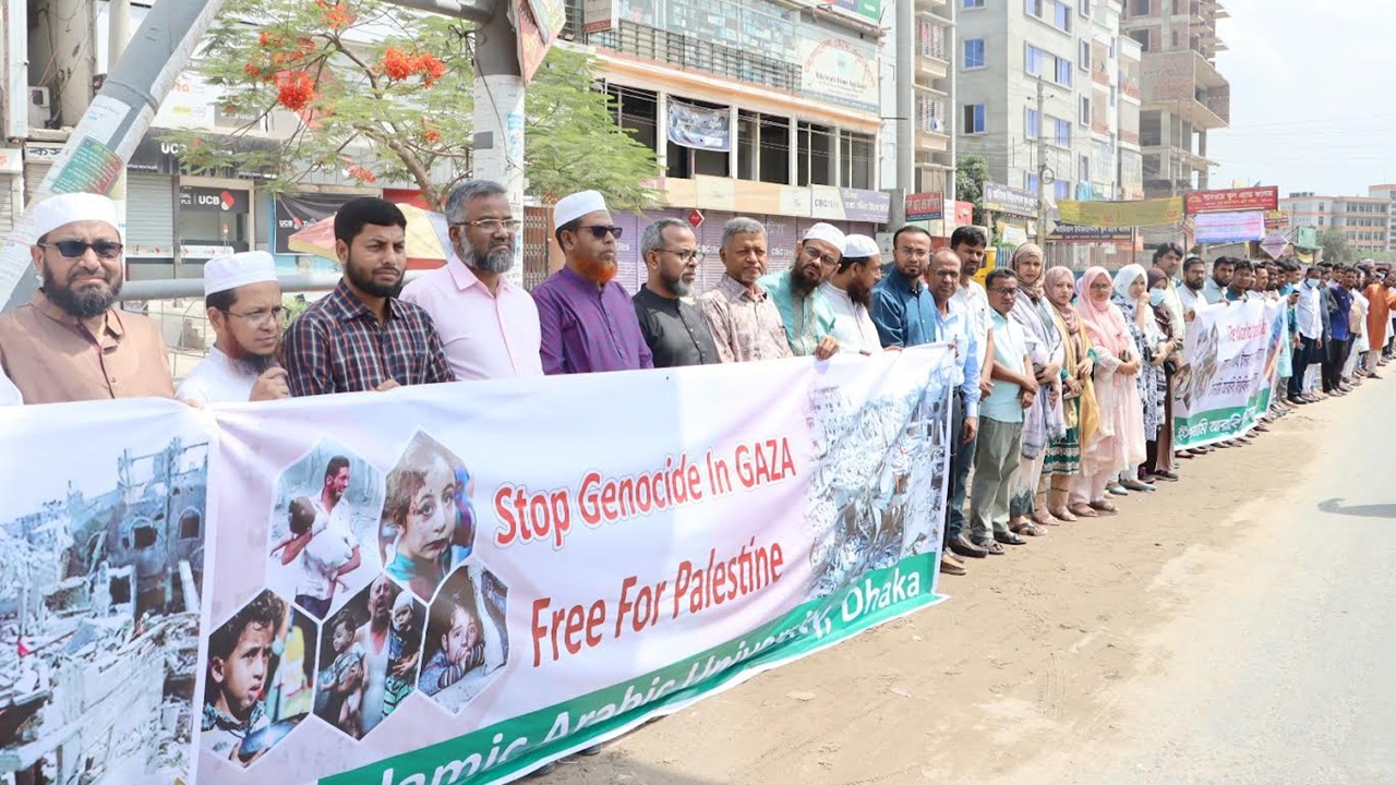 ফিলিস্তিনের গাজা ও রাফা শহরে ইসরায়েলের বর্বরোচিত হামলা ও গণহত্যার প্রতিবাদে মানববন্ধন কর্মসূচি পালন করেছে ইসলামি আরবি বিশ্ববিদ্যালয়ের (ইআবি) শিক্ষক কর্মকর্তারা।